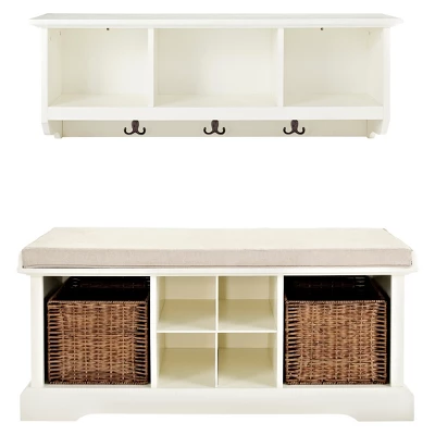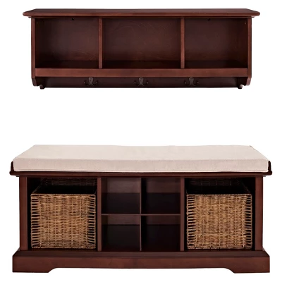 Organize your entryway with a sophisticated bench set that’s built to last. This cubby bench has several slots for storing shoes and other small items, and also makes for a comfortable seat. Included baskets allow for storage of scarves, gloves, and hats while adding a beautiful touch to your entryway. The matching wall unit features open shelves for storing hats and the like. Four hooks are perfect for hanging a family of coats and jackets.