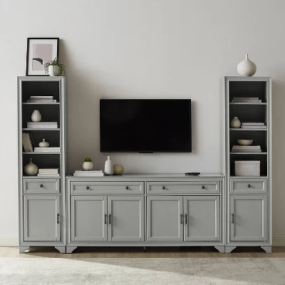 Whether you love a traditional look or a modern farmhouse vibe, the Tara 3pc Entertainment Set is a stylish take on a classic entertainment center. The sideboard features two wide full-extension drawers and two large cabinets with adjustable shelves. Each bookcase has a full-extension drawer and three open adjustable shelves. The Tara 3pc Entertainment Set is a great storage option for framing large TVs up to 65″.