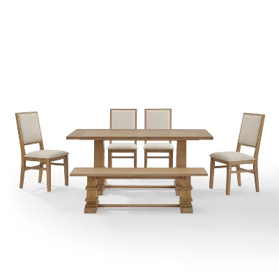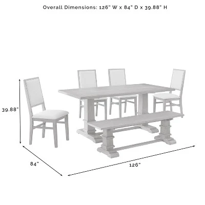 The Joanna 6pc Dining Set embodies the laid-back elegance of modern farmhouse design. Featuring a large rectangle trestle table, four chairs, and a dining bench, this set can seat seven diners comfortably. Each chair features plush linen upholstery and a unique wooden X design on the back. The bench echoes the design of the trestle table with two pedestal columns and a large rectangular seat. Each piece of the Joanna dining set comes together to create the perfect spot for a family meal. Overall Product Dimensions: 126”W X 84”D X 39.88”H