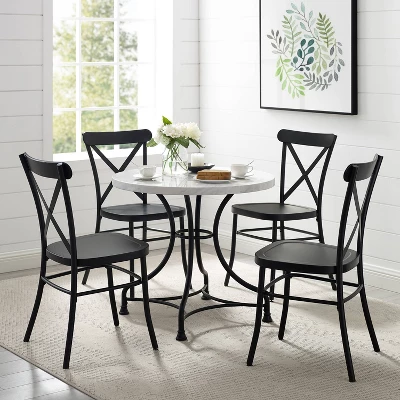 Quaint and classy, the Madeleine 5pc Dining Set w/Camille Chairs brings stylish café dining to your home. The faux marble tabletop creates an upscale look while the steel base and Camille chairs add a French industrial aesthetic. The open pedestal design of the table base forms a sleek profile and provides cozy seating for up to four..