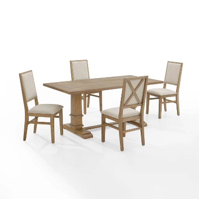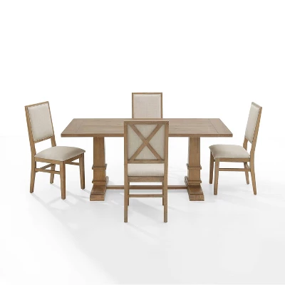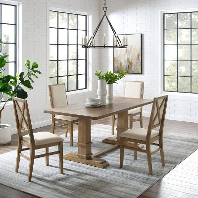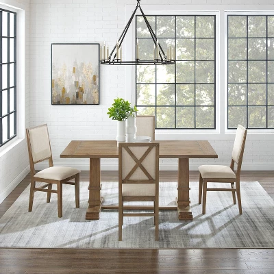 Embrace the laid-back style of modern farmhouse design with the Joanna 5pc Dining Set. The large rectangle trestle table pairs beautifully with the upholstered dining chairs, offering seating for four diners. Each chair features upholstered backs and seats with a classic wooden X design on the back. Balancing the table’s substantial trestle base is a spacious tabletop, making the Joanna 5pc Dining Set a perfect spot to gather for a family meal.