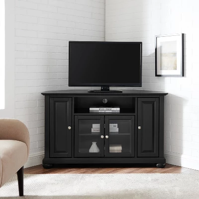 Enhance your living space with Crosley’s impeccably-crafted 48″ Corner TV stand. This signature cabinet accommodates most 48″ flat panel TVs, and is handsomely proportioned featuring character-rich details sure to impress. The hand rubbed, multi-step black finish with brushed nickel hardware is perfect for blending with the family of furniture that is already part of your home. Raised panel doors strategically conceal stacks of CD/DVDs, and various media paraphernalia. Tempered beveled glass doors not only add a touch of class; they protect those valued electronic components, while allowing for complete use of remote controls. The open storage area generously houses media players and the like. Adjustable shelving offers an abundance of versatility to effortlessly organize by design, while cord management tames the unsightly mess of tangled wires. Style, function, and quality make this cabinet a wise choice for your home furnishings needs.