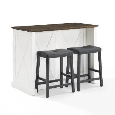 Delivering modern farmhouse charm to your kitchen, the Clifton Kitchen Island with Saddle Stools provides space for food prep and dining. An ideal focal point for your culinary space, the island features a large countertop, plus an overhang for the counter height saddle stools. The cushioned seats of the backless stools are curved for comfort. Featuring two large cabinets with adjustable shelving and two full-extension drawers, the island will keep your kitchen organized and clutter-free. Perfect as a breakfast bar, dining area, or for dishing up your favorite meal, the Clifton Kitchen Island with Saddle Stools is a fabulous addition to your home.