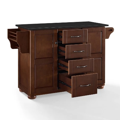 Prepare all your meals with ease using the Eleanor Kitchen Island. Featuring two cabinets each with an adjustable shelf plus four spacious drawers, all your kitchen items are close at hand. A built-in spice rack and paper towel holder keep the beautiful granite countertop free of clutter. Classic bun feet and raised panels on the drawer and cabinet fronts make the Eleanor Kitchen Island an elegant addition to your kitchen space.