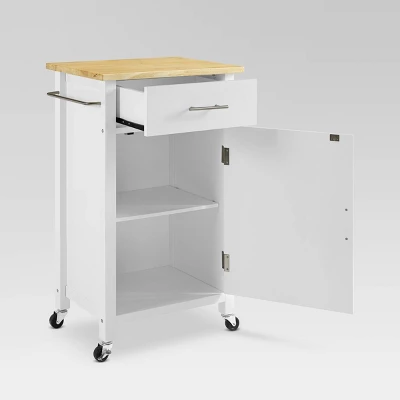 Organize your kitchen with the space-saving design of the Savannah Compact Kitchen Island/Cart. Ideal for adding extra storage and workspace, this island offers a solid natural wood countertop and large cabinet with an adjustable shelf inside. The caster wheels on that base allow you to create a flexible food prep or serving space, while the full-extension drawer adds an ideal spot to tuck away everyday items. By adding a towel bar on one side and two utility hooks on the other, the Savannah Compact Kitchen Island addresses all of your at-home chef needs.