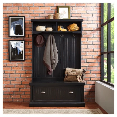 Capture the feeling of an effortless beach home with the Seaside Hall Tree from Crosley. Have a seat on the full-sized bench seat, perfect for getting ready for the day. Constructed from solid hardwood and veneers, the weathered surface softens the classical lines and suits any home. Pull the drop-down drawers forward with genuine metal hardware and find two spacious cubbies inside, perfect for storing shoes, scarves, and other clutter best kept out of sight. The tall, slatted back is equipped with hooks for hanging coats out of the way, and two more overhead cubbies offer space for decor or storage.