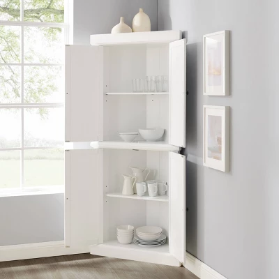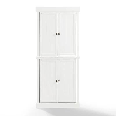 With charming beadboard details, the Shoreline Pantry provides a dash of coastal flair to home organization. Comprised of two identical stackable pantries, this set is connected with a sturdy metal plate, offering ample storage without taking up valuable floor space. Ideal for smaller rooms, the Shoreline Tall Corner Pantry offers adjustable shelving and is designed to tuck neatly into any corner of the home. OVERALL PRODUCT DIMENSIONS: 31.75”W X 15.75”D X 72”H