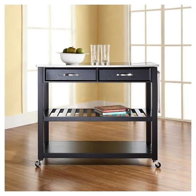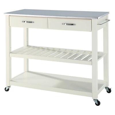 Create the culinary space of your dreams with a Stainless Steel Top, Portable Kitchen Cart/Island from Crosley. Constructed of solid hardwood with wood veneers and heavy-duty casters, this kitchen island is designed for longevity and portability. The contemporary stainless steel top expands your serving and countertop space while the built-in drawers and adjustable shelf offer much-needed extra storage. Raised panel detailing clean, sleek lines provides the ultimate in style to dress up any space. Style, function, and quality make this portable kitchen island a versatile, must-have addition to your home.
